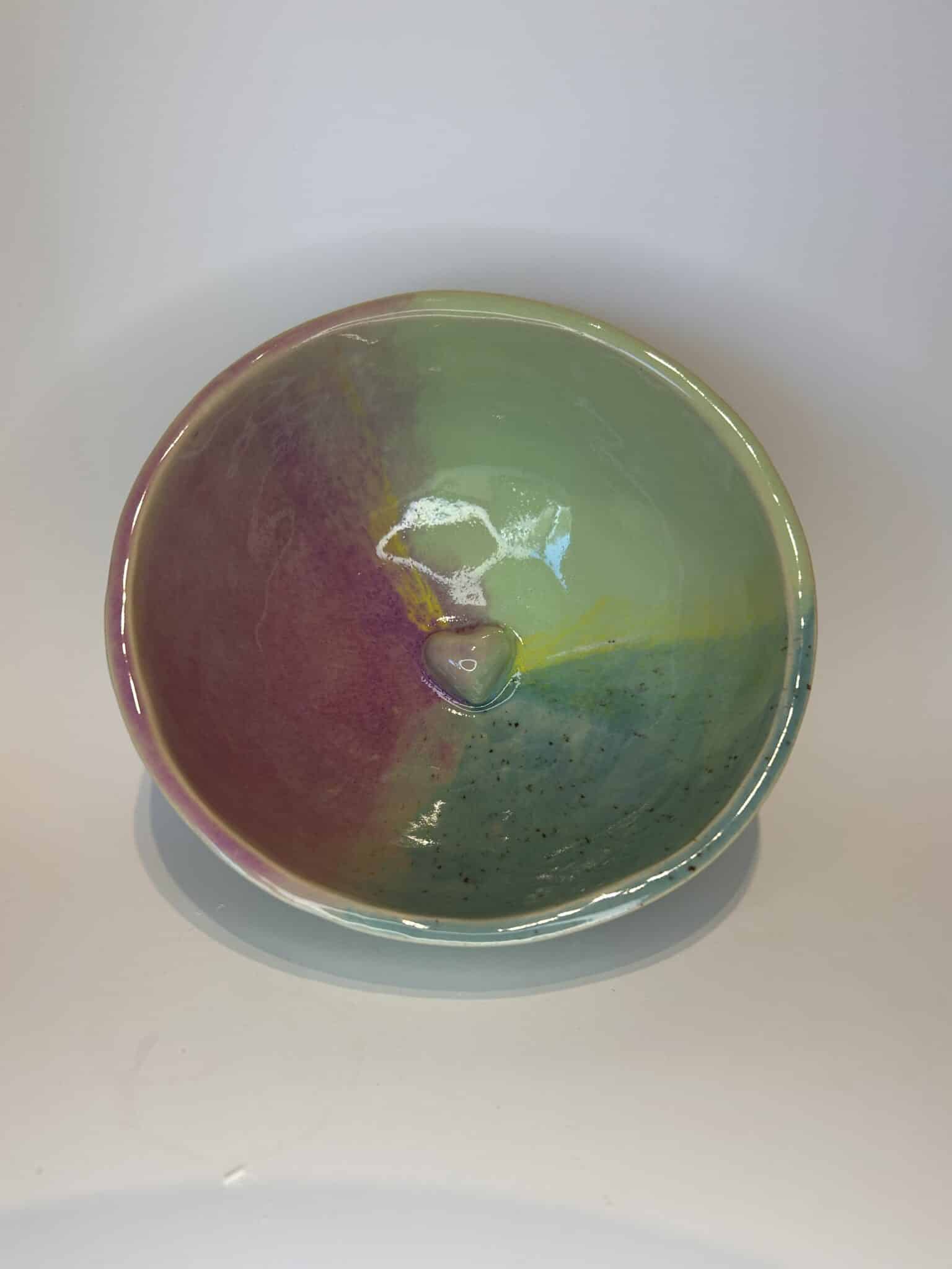 Skål m. hjerte i bunden. ca 15 cm. lys grøn – blå – lilla